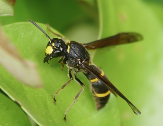 一旦はハグロフタオビドロバチとして保存していた画像だが、見直してみると、翅に他の画像のような紫がかった濃さが感じられない。疑問を持ったので図書館に行って図鑑で照合したところ、頭盾下部のW型の切れ込みがオデコの♀に似ている。ただ、これらは外見上の判断なので同定の自信度は50%程度か。採集していないとこの辺りが精度の限界。