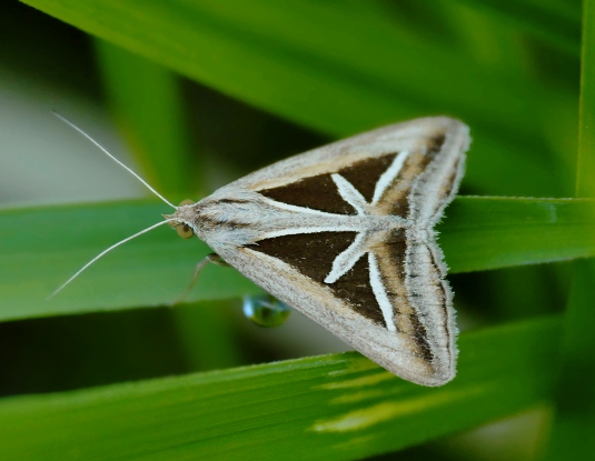 独特の三角紋を持つヤガの一種。草むらの中で隠れるように静止していたところを見つけた。元々は太平洋諸島からインド、台湾など熱帯地に生息していた南方種。日本では沖縄で見られていたが、近年になって九州、四国、本州まで分布を広げている。幼虫の食草は「ヤハズソウ」が知られている。