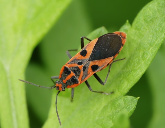 この辺りでよく見かける「ヒメジュウジナガカメムシ」と間違えそうな色彩だが、よく見ると体の模様は異なる。当地では数は少ないようで初見・初撮りとなった。かつてはナガカメムシ科に含まれていた種だが、近年の分類体系で独立したマダラナガカメムシ科の一員となった。わが国のSpilostethus属の記録はこれ一種のみで、南西諸島から九州、四国に分布するとされている。