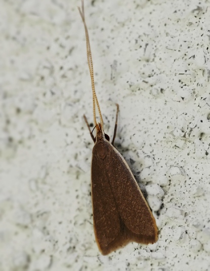 目立った模様もない小さな蛾でスルーするところだったが、長い触覚を前方に突き出している姿が印象的だったので撮ってみた。沖縄から東北地方まで広く分布するが四国での記録は近年になってからのようだ。日が当たらない所にいたので切れの無い画像になってしまったのは残念。