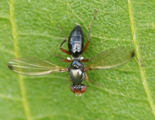 光沢があるスリムな体型と翅端付近の暗色斑から判断した。現場では気付かなかったが、胸背には剛毛が生えている。ネット情報では冬季でも活動しているようだ。ヒメコバエ科(Opomyzidae)に分類されているがマイナーなグループらしく、日本での既知は本種のみのようだ。