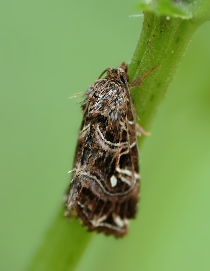 朝露で湿った水路脇の草地で見つけた。色彩的に濃く「クロキスジツマキリヨトウ」に似るが、中室端にある白点が比較的大きく、外横線に沿って桃色帯のような痕跡が伺えることから「キスジツマキリヨトウ」とした。クロの方は南方系らしく日本では主に屋久島や 奄美大島以南に分布しているようだ。