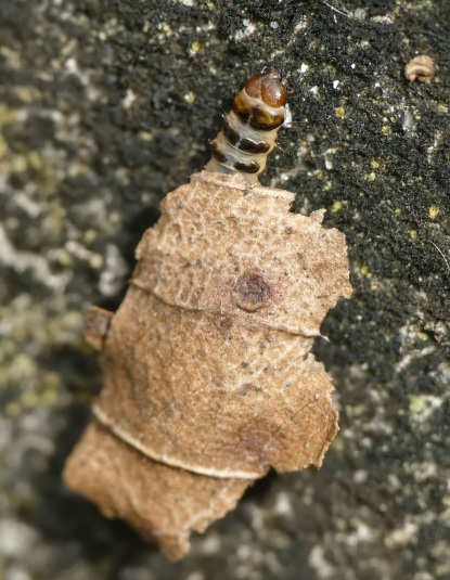 初夏の雑木林でよく見かける愛らしい蛾。小さい体に触角がやたらと長くて目立つ。この触角を立てながらヒラヒラと飛ぶ姿は印象的だ。本種もメス=写真はこちら=は触角があまり長くない。画像下は幼虫と思われる芋虫。ケースは平べったくミノガの形とは異なる。最も頻繁に見られるホソオビヒゲナガと推定したが、正確な種名はよく分からない。